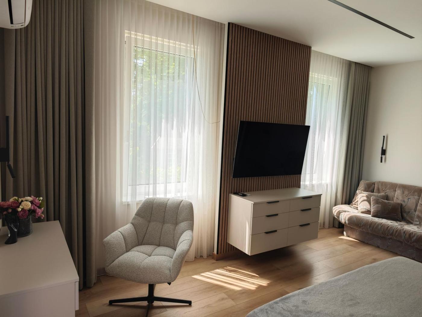 Boasting garden views, Kambarių nuoma ant marių kranto provides accommodation with patio, around 1.6 km from Juodkrantė Beach. This property offers access to a terrace and free private parking. Featuring family rooms, this property also provides guests with an outdoor fireplace.
